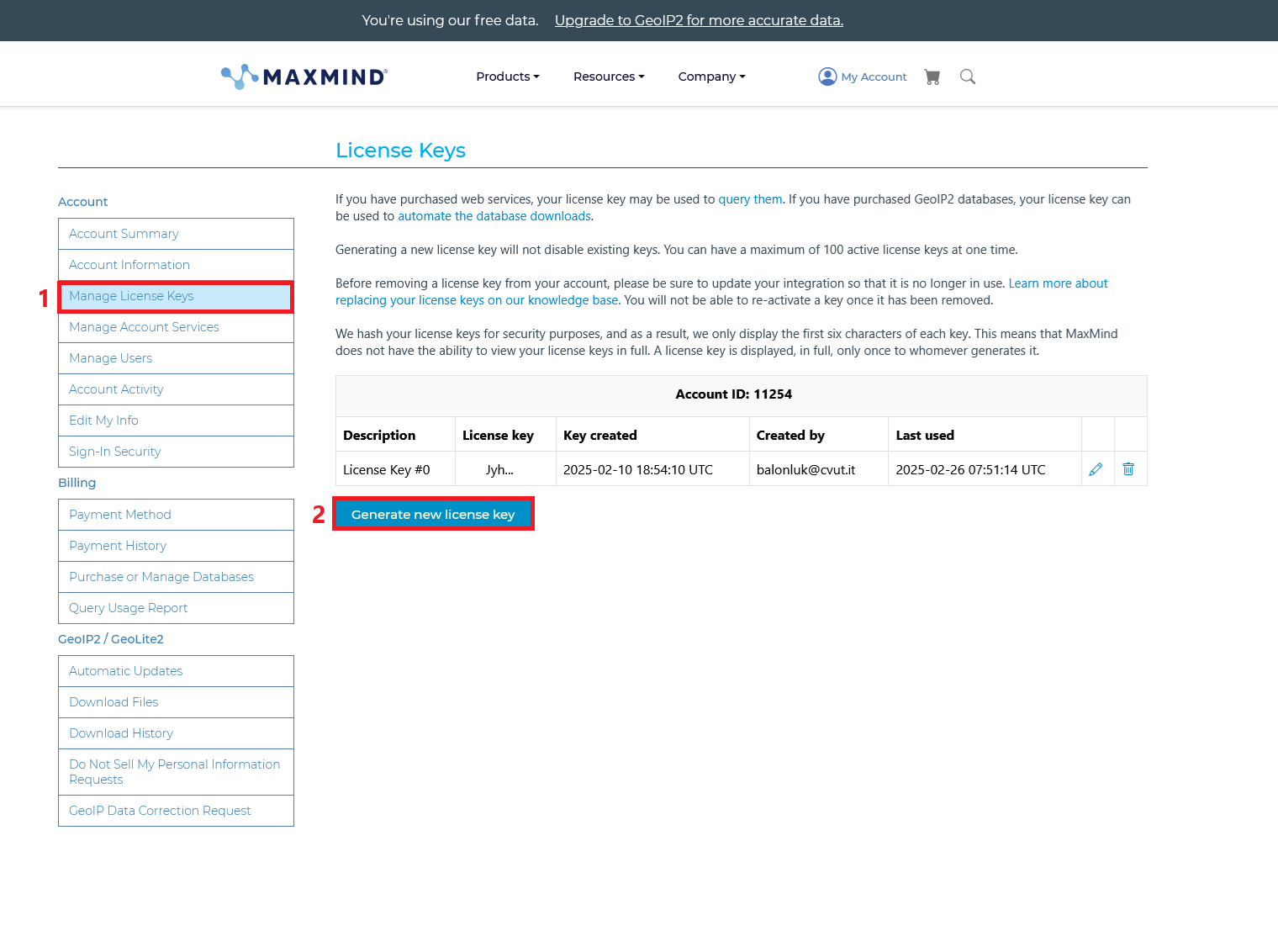 💡 Kombinace Account ID a License key bude použita v konfiguraci služby která pravidelně stahuje nejnovější verzi databází.