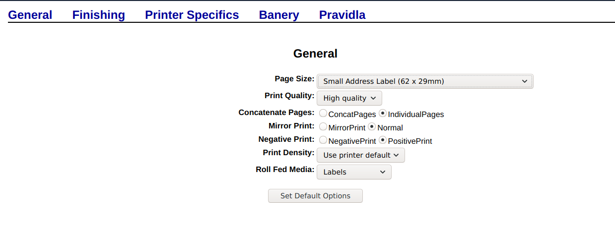 Přidat CUPS tiskárnu s následujícími parametry: